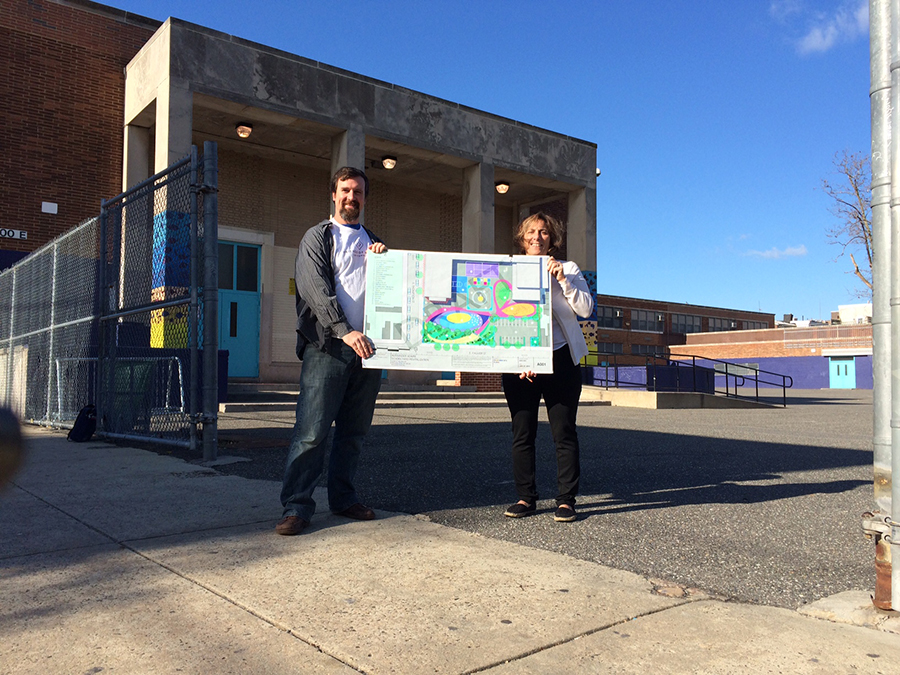 Principal Jenkins and a member of the Friend of Adaire Program pose with plans for the new school yard.